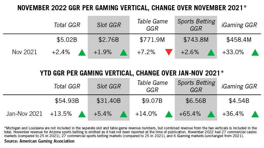 Through November, U.S. casino slot machines and table games have generated revenue of $43.79 billion, tracking 6.7% ahead of the same eleven-month period of 2021, reports AGA.