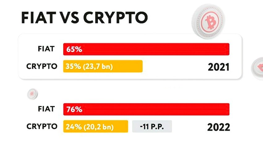 However, compared to 2021, the overall amount of crypto bets decreased by 14.6% to EUR 20.2 billion. The EUR 3.5 billion ($3.7 billion) drop on the crypto side influenced the fiat share growth. By the end of 2022, the total fiat bets accounted for 76% of the total player bets.