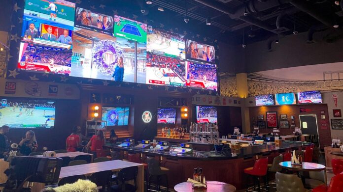 Above that bar is a jumbotron, a 34-foot-wide viewing screen. On Friday, a ribbon cutting and soft launch were held, and the facilities officially opened during the weekend, just in time to place wagers for college basketball during March Madness.