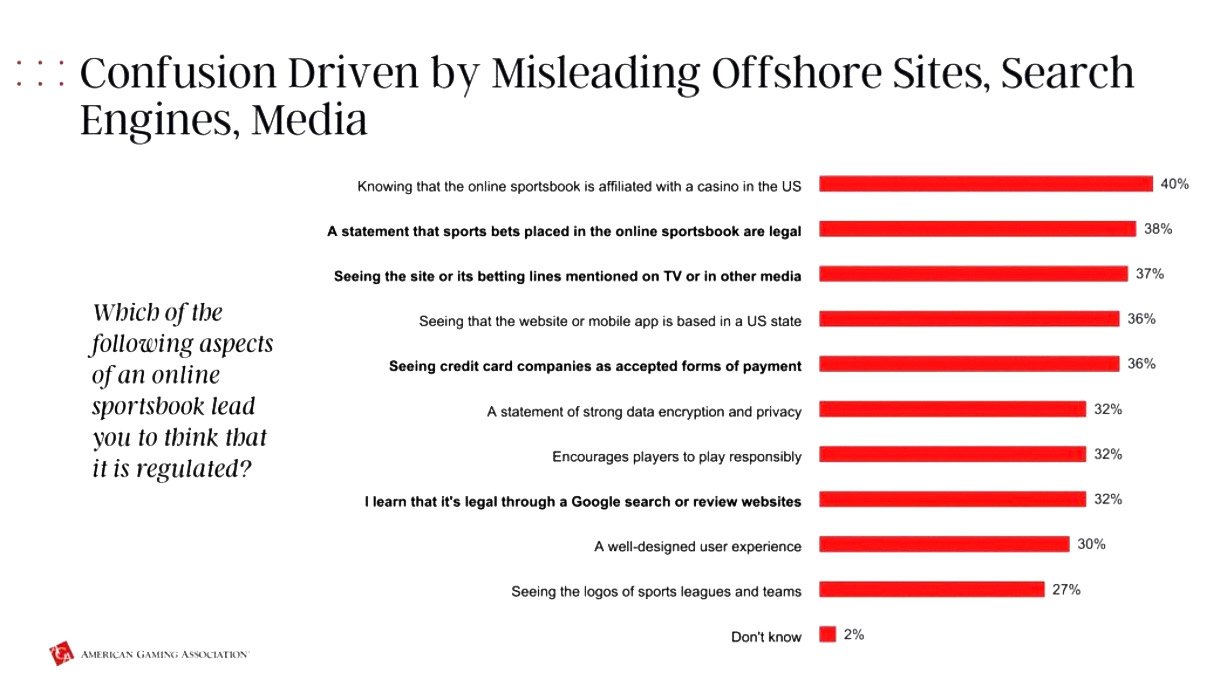 This consumer confusion is in part attributable to illegal offshore sites misrepresenting their legal status by marketing themselves as regulated sites. Among online sports bettors, they believe a site is legal based on a statement on the website (38%), odds being mentioned by the media (36%), and search results (32%).