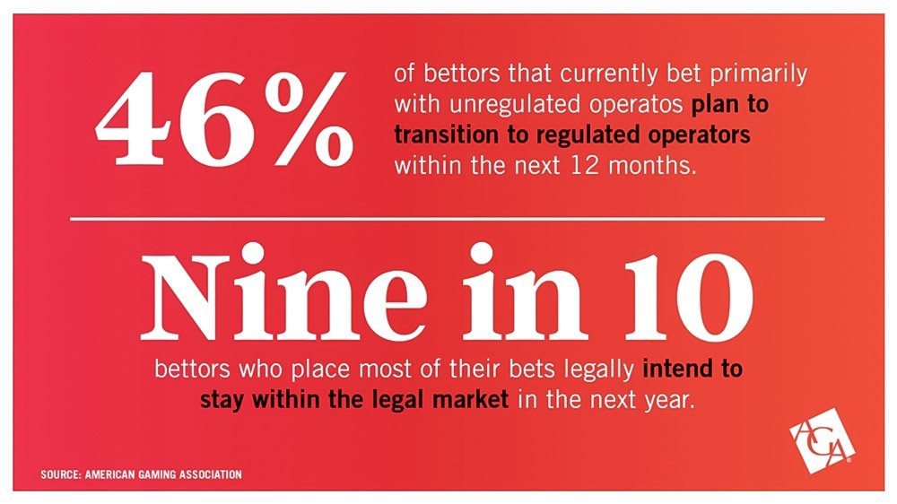 These efforts are seemingly paying off. The research noted that nine in 10 (90%) bettors who place most of their bets legally intend to stay within the legal market in the next year. And as per the American Gaming Association, nearly half (46%) of bettors that currently bet primarily with unregulated operators plan to transition to regulated operators within the next 12 months.