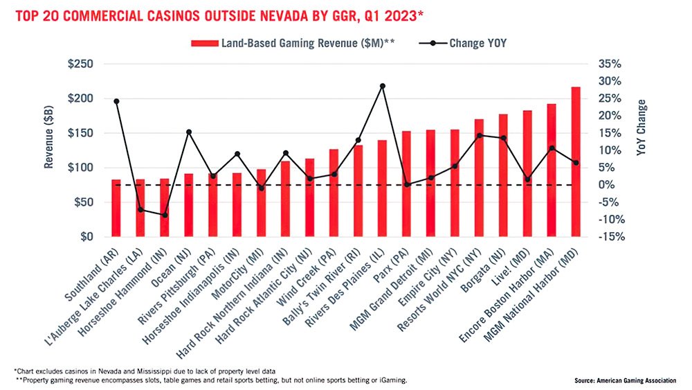 As for individual casinos, 17 out of the top 20 highest-grossing commercial casinos outside of Nevada experienced growth compared to Q1 2022. MGM National Harbor in Maryland maintained its position as the top-grossing casino, while Encore Boston Harbor in Massachusetts surpassed Live! Casino in Maryland to secure the number two position.