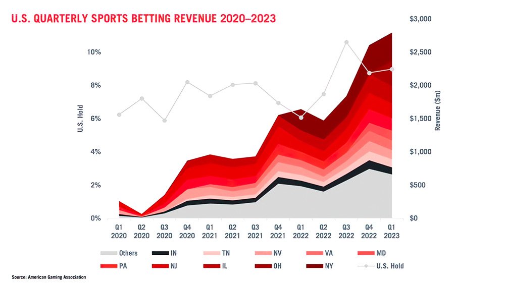 Legal sports betting: Nationwide, Americans wagered a record $31.1 billion on sports in Q1 2023, generating an all-time high of $2.79 billion in quarterly revenue (up 70.1% year-over-year). The growth compared to Q1 2022 was largely driven by new market launches in Kansas, Massachusetts and Ohio, and the launch of mobile betting in Maryland. Ohio quickly established itself as a major player during the period, generating $387.3 million in revenue and $2.49 billion in handle, the second largest market in the country behind New York.