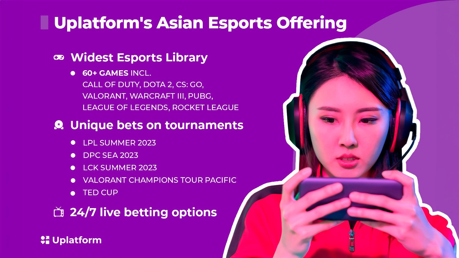 As the popularity of Esports continues to rise, there has been a growing interest in making bets on these events. The rapid growth of Esports in Asia, combined with its inclusion in the sports betting market, bodes well for both markets and contributes to the general expansion of sports betting. Fortunately, Uplatform is here to meet this need, providing access to over 300 betting markets, 60+ Esports games, and 9500 pre-match and live events. With Uplatform’s extensive range of services, operators can effortlessly reach and engage a wider audience.