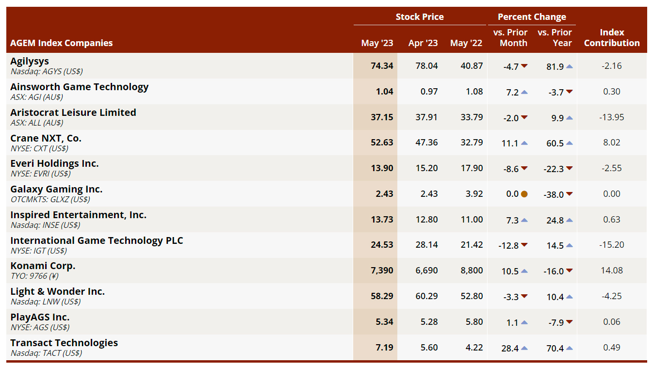 The AGEM Index is a monthly stock performance guide comprising 12 global gaming suppliers. During the latest month, six of the 12 AGEM Index companies reported stock price increases, which resulted in six positive contributions to the AGEM Index, five negative contributions, and one neutral contribution.