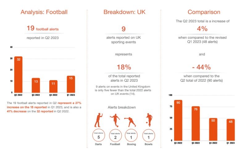 Among the key data presented in the report, football (soccer) had the highest number of alerts in Q2 2023, with 19 incidents. This represents a 27% increase from the 15 alerts reported in Q1 2023 but a notable 41% decrease from the 32 alerts reported during the same quarter in 2022.