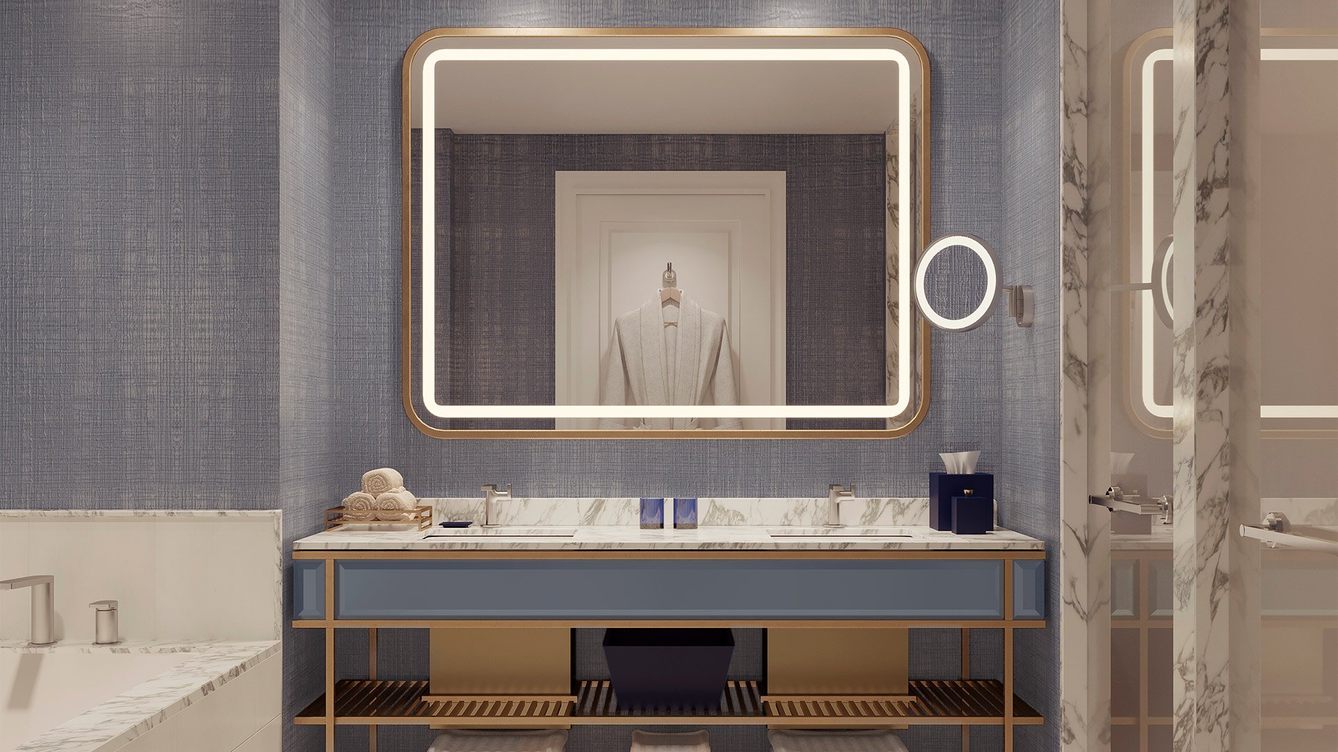 The rooms and suites are designed to evoke “an understated, timeless elegance” rooted in the Fontainebleau brand identity. A color palette of blue and silver water tones with dashes of coral pink is accented by mercury-glass mirrors and brass details.