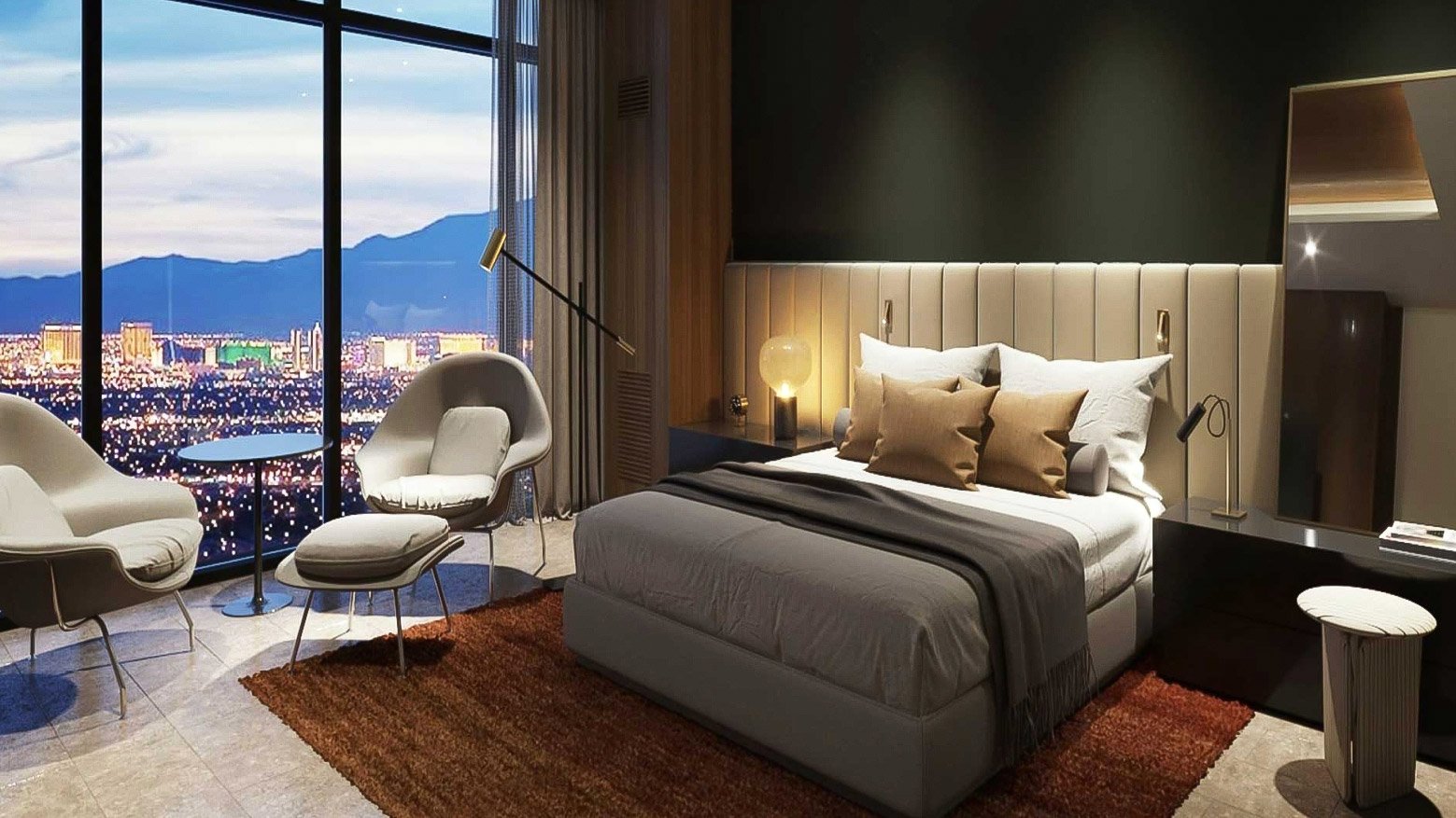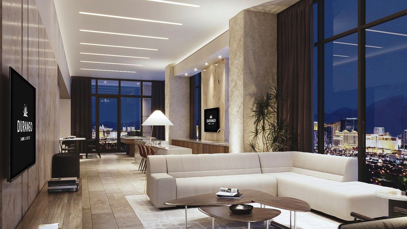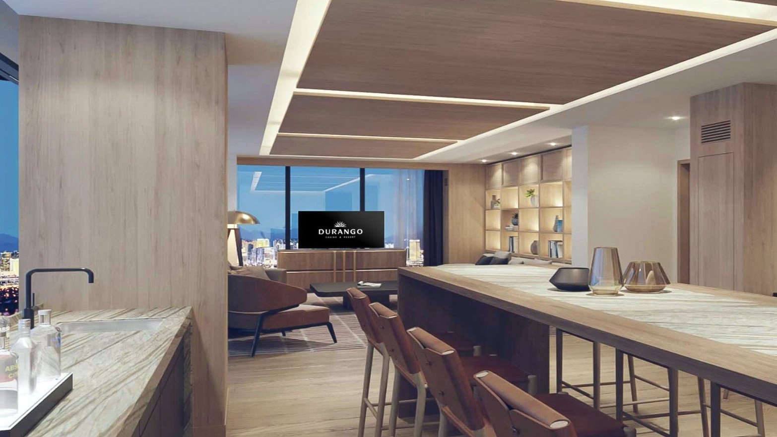 The Terrace Suite is located on the 15th and 16th floors of Durango and has a curved waterfall-edged bar, a backlit library, a dining room, and a corner balcony for catching the sunset. The spacious one-bedroom suite comes with an optional double queen connector and is equipped with everything needed for “a luxe Vegas vacation” – well-appointed furnishings and amenities.