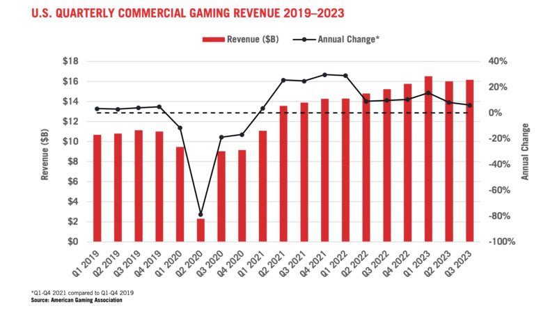 The commercial gaming industry in the United States experienced its most successful third quarter to date, generating a record-breaking revenue of $16.17 billion. This also marks the eleventh consecutive quarter of year-over-year (YoY) growth.