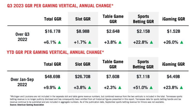 As per American Gaming Association’s Commercial Gaming Revenue Tracker, U.S. commercial gaming revenue grew by 6.1 percent in the third quarter of 2023. Total revenue for the first nine months of 2023 stands at $48.69 billion, 9.9 percent higher than the same period in 2022. Even with potential softer Q4 revenue this year, 2023 is poised to become the third consecutive record-breaking year for the commercial gaming industry.