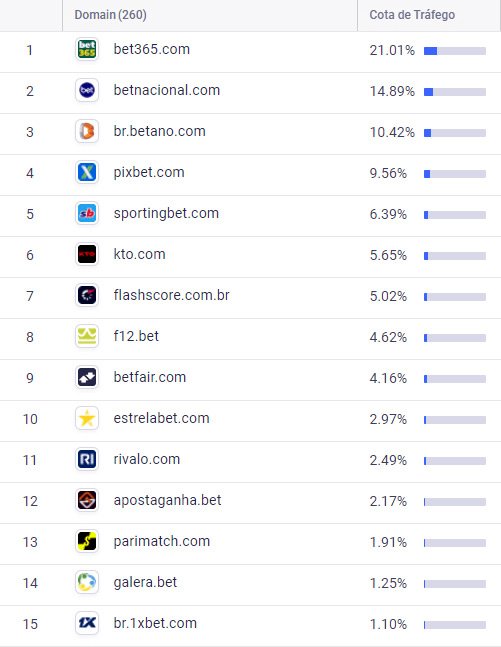 The bet365 bookmaker was the leader in accesses in November, with about 21% of traffic. It was followed by Betnacional (14%), Betano (10%), Pixbet (9%) and Sportingbet (6%)