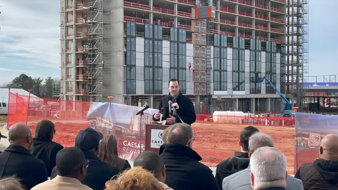 Caesars Virginia commemorated the advancement in the construction of the upcoming hotel and casino complex by holding a topping-off ceremony Thursday afternoon for the property’s 12-story hotel.