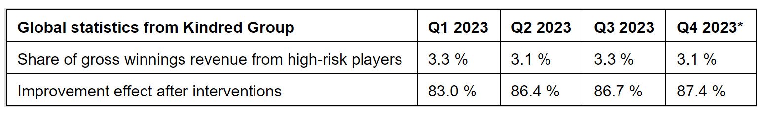 Online gambling heavyweight Kindred Group said its share of revenue from harmful gambling has shown a minor reduction to 3.1% in the fourth quarter of 2023, from 3.3% in Q3.