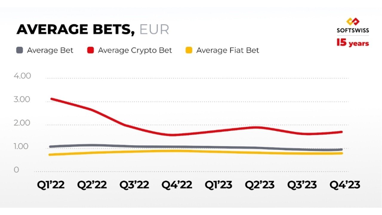 The average fiat bet remained steady at around 0.82 euro ($0.89) throughout the previous year. Despite fluctuations in the average crypto bet during 2023, ranging from 1.59 to 1.88 euro ($1.72 to $2.04), the changes appear modest compared to the twofold drop observed in the average crypto bet during Q4’22, which reached 1.56 euros ($1.69). This indicates a certain level of stabilization in the average crypto bet throughout 2023.