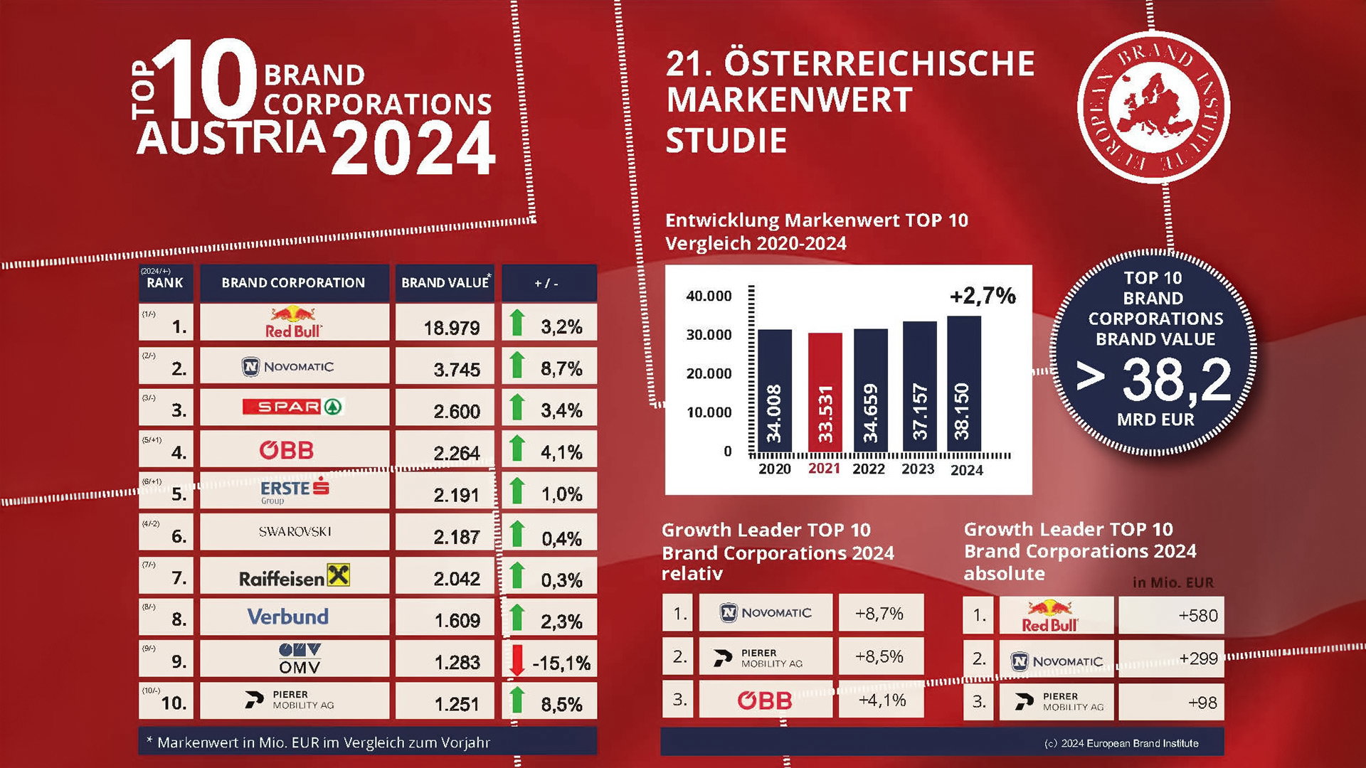 Novomatic’s brand value increased by 8.7% to EUR 3.745 billion ($4.01 billion), marking the largest increase among the country’s top 10 brands. Only Red Bull outranked the Lower Austrian company.