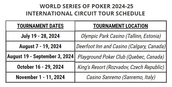 The international tour will kick off with Tallinn, Estonia at Olympic Park Casino on July 19-28 and continue through Italy’s Casino Sanremo from November 1 to November 11.