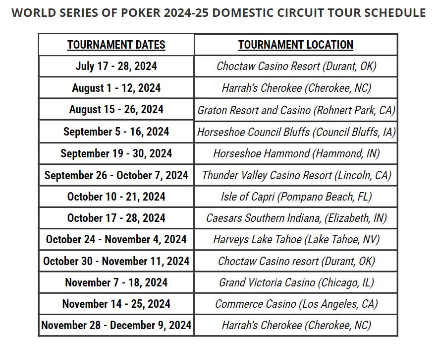 The regional poker tour returns for its 20th season beginning Wednesday, July 19 at Choctaw Casino Resort in Durant, Oklahoma, immediately following the conclusion of the 2024 World Series of Poker in Las Vegas. Additional dates for 2025 will be announced later this fall on WSOP.com.