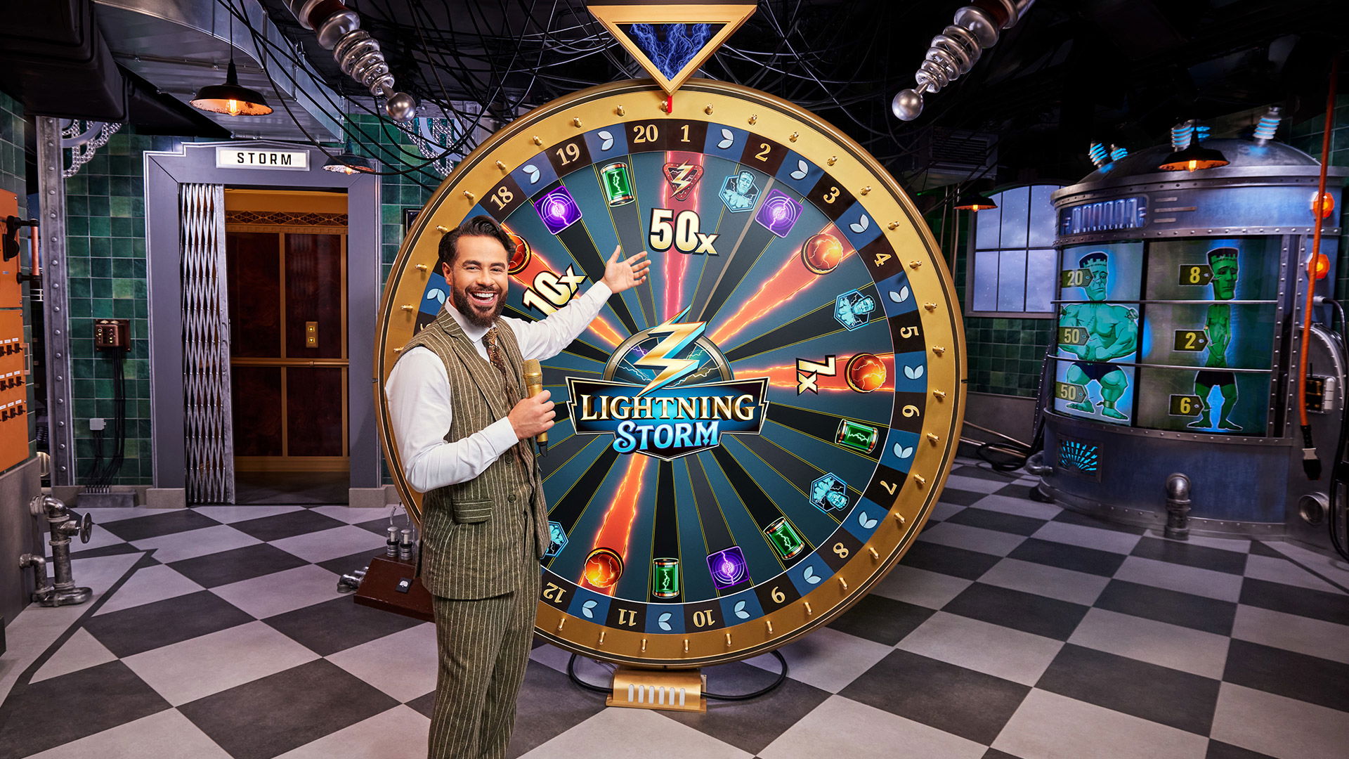 Lightning Storm is Evolution’s newest title, and it comes from the Lightning family of games. Set in a dark, mad scientist laboratory-style studio, the live game show features a money wheel with DigiWheel patented technology. The action starts when a player places a bet, and the game host spins the 39-segment DigiWheel.