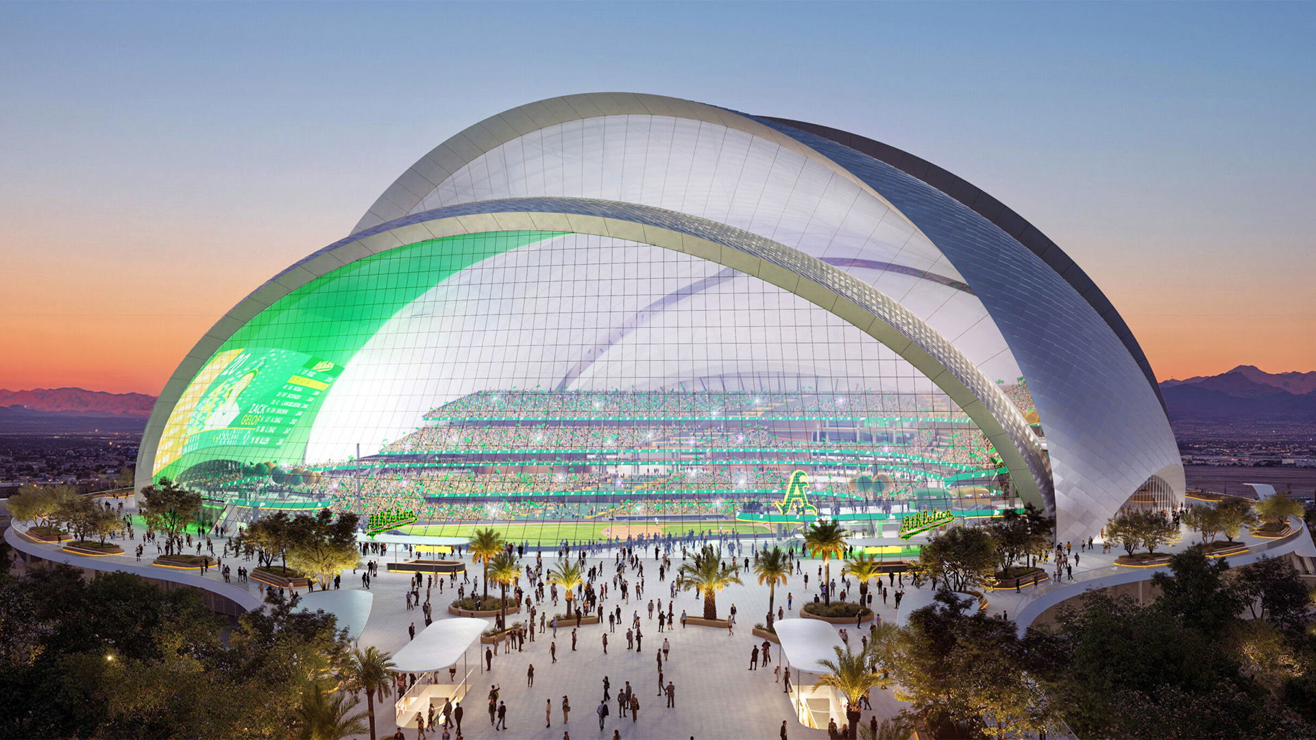 The fixed-roof, climate-controlled ballpark is scheduled to feature a massive curtain glass wall providing a view of the Strip, looking toward the MGM Grand and the New York-New York.