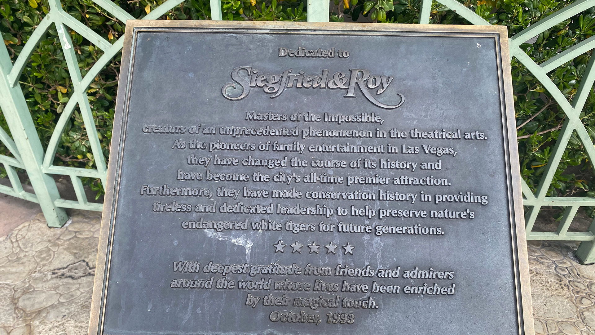 - A 17-foot-tall sculpture of Siegfried & Roy with a giant white tiger, which was dedicated on October 27, 1993, by then-owner and hotel founder Steve Wynn.