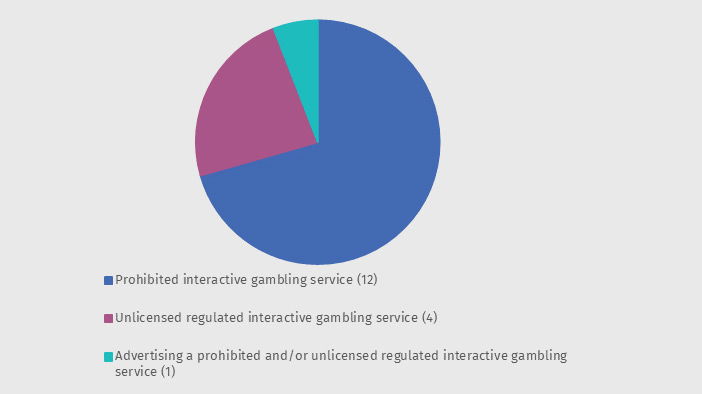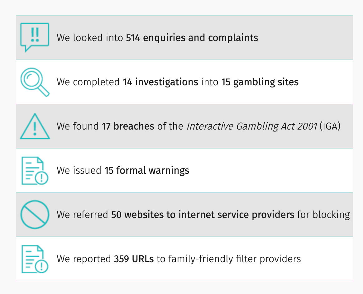 Of the complaints received, 463 (90%) were valid and required investigations under the IGA. Of such investigations, 17 were found to violate the Interactive Gambling Act, with 12 operators found to be providing a prohibited interactive gambling service to Australian customers.