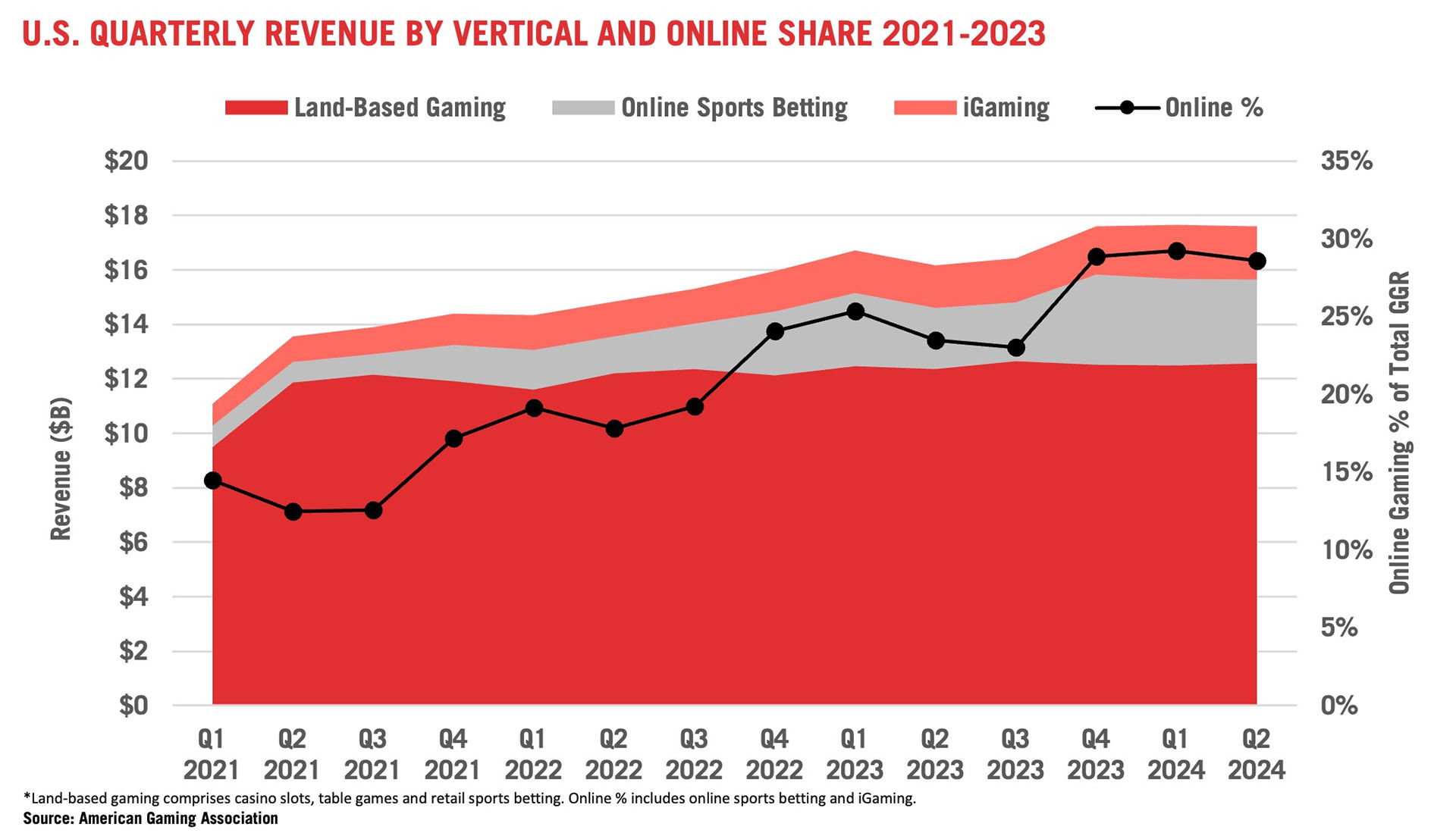 Quarterly revenue from land-based gaming – including casino slots, table games, and retail sports betting – totaled $12.57 billion, 1.6% higher than the same period last year. The rate of growth for land-based gaming improved slightly year-over-year from Q2 2023 and significantly from Q1 2024.