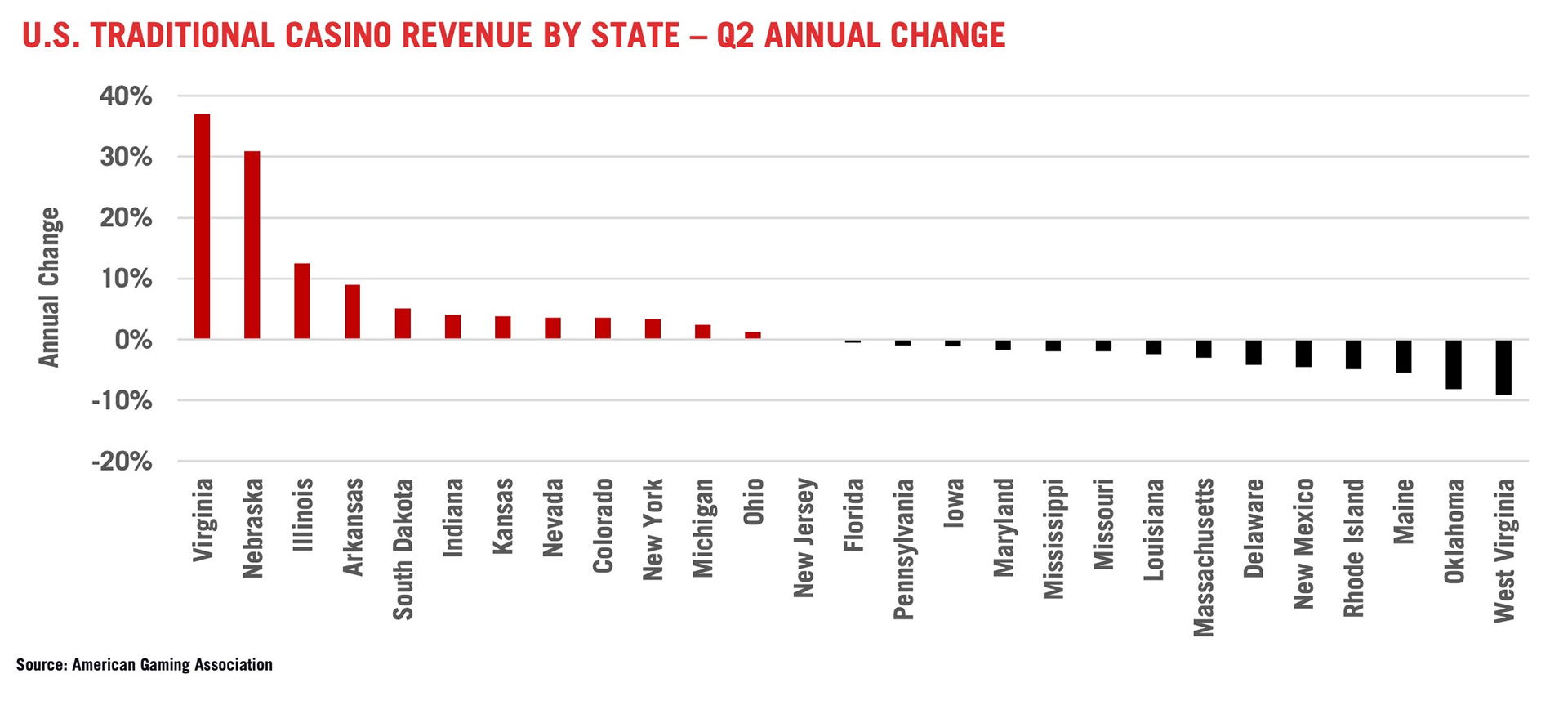 At the state market level, Q2 results were thoroughly mixed with 15 of 27 markets posting traditional casino revenue declines compared to the prior year by an average of 3.3 percent. The 12 states that expanded traditional casino revenue in the second quarter – by an average of 9.7% – were led by Virginia, Nebraska, and Illinois which each continued to benefit from new property openings.