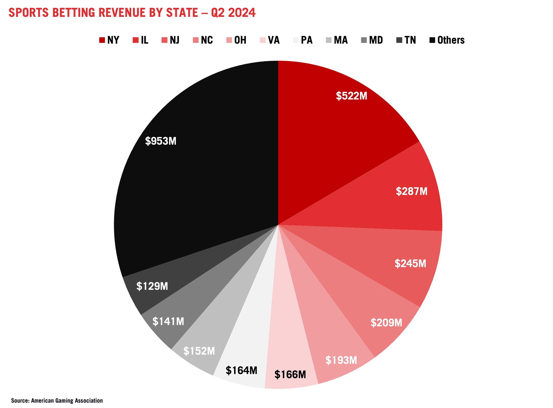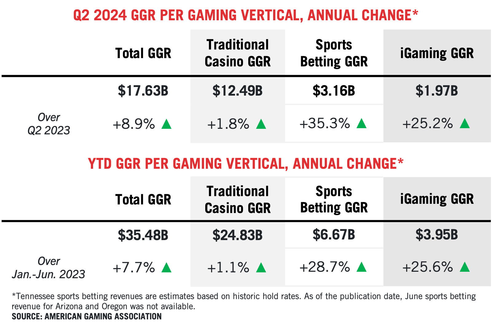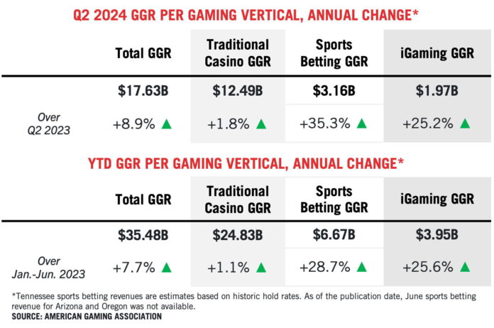 Second-quarter sports wagering revenue grew 35.3% to $3.16 billion, a 35.3% increase year-over-year and setting a new record for second-quarter revenue.