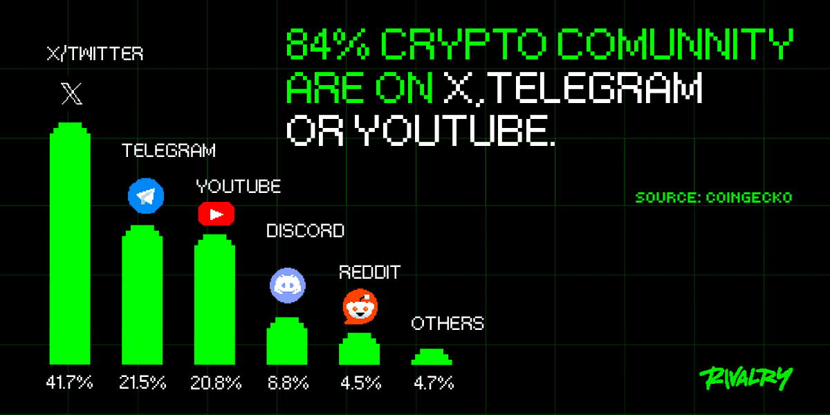 Research shows that the key channels amongst crypto users–which overlaps with digital natives largely–include X (Twitter), Telegram, and Youtube, which combined reach 84% of this community, followed by Discord and Reddit.