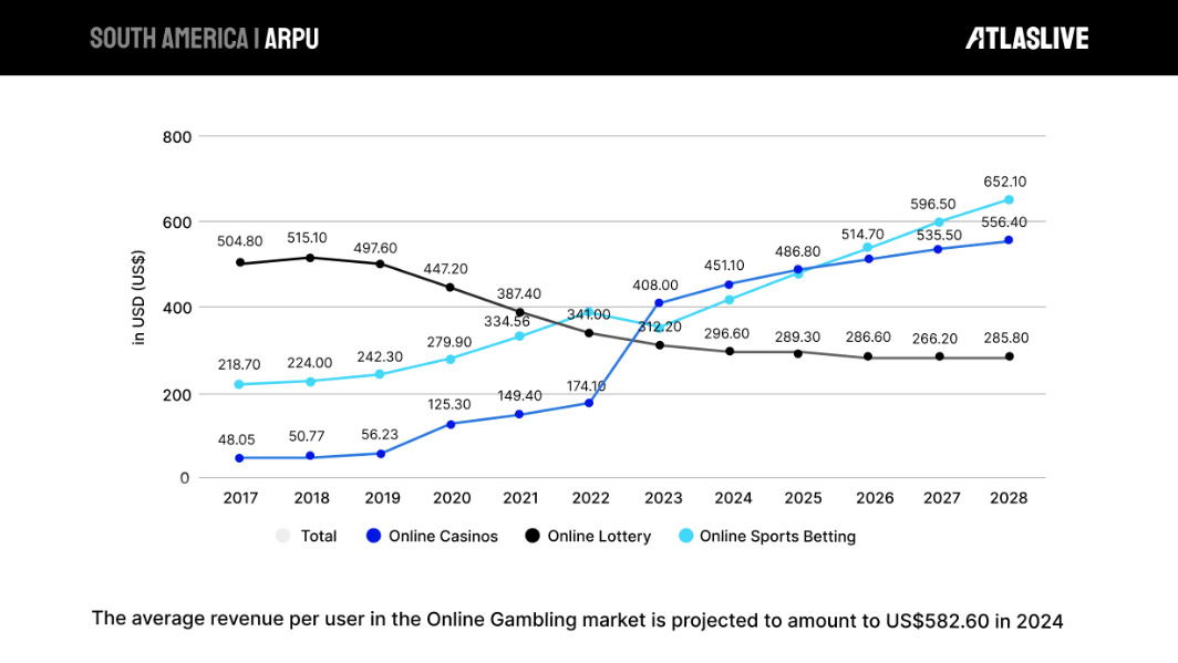 User penetration in South America’s online gambling market is projected to reach 2.1% in 2024, signaling ample room for growth as more individuals explore and engage in online gaming activities.