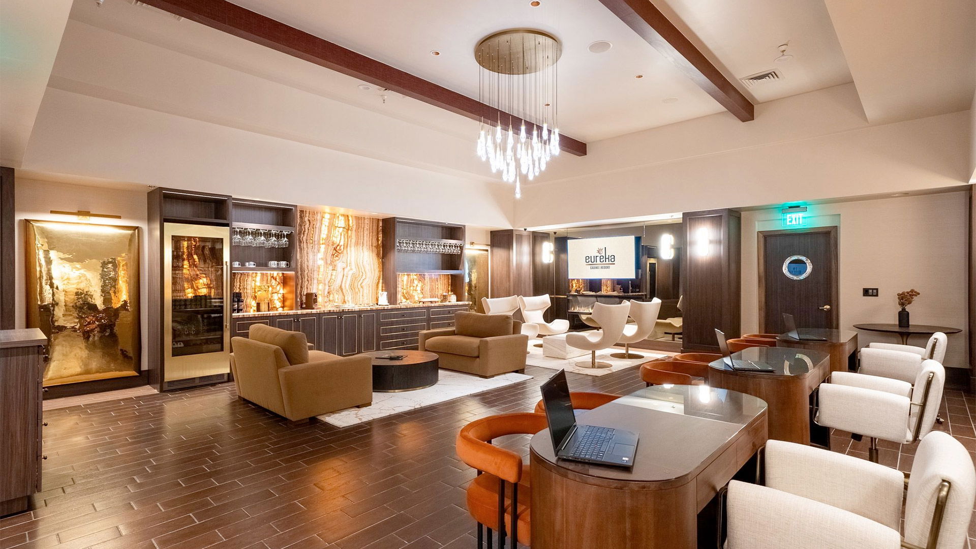 Located just off the gaming floor, the Onyx Lounge serves guests who have reached the Onyx tier, the highest level in Eureka’s Gold Club loyalty program. The space was designed as a quiet, elevated retreat. Its contemporary look features polished dark wood, gold accents, and a glowing onyx backsplash.