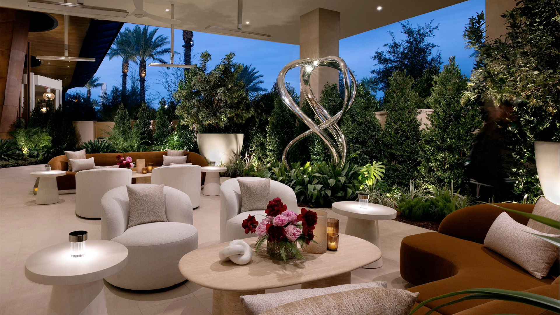 The bar offers wine, champagne, cocktails, premium spirits and a 24-hour coffee and tea program. A covered patio includes seating, sports viewing and cigar smoking areas.