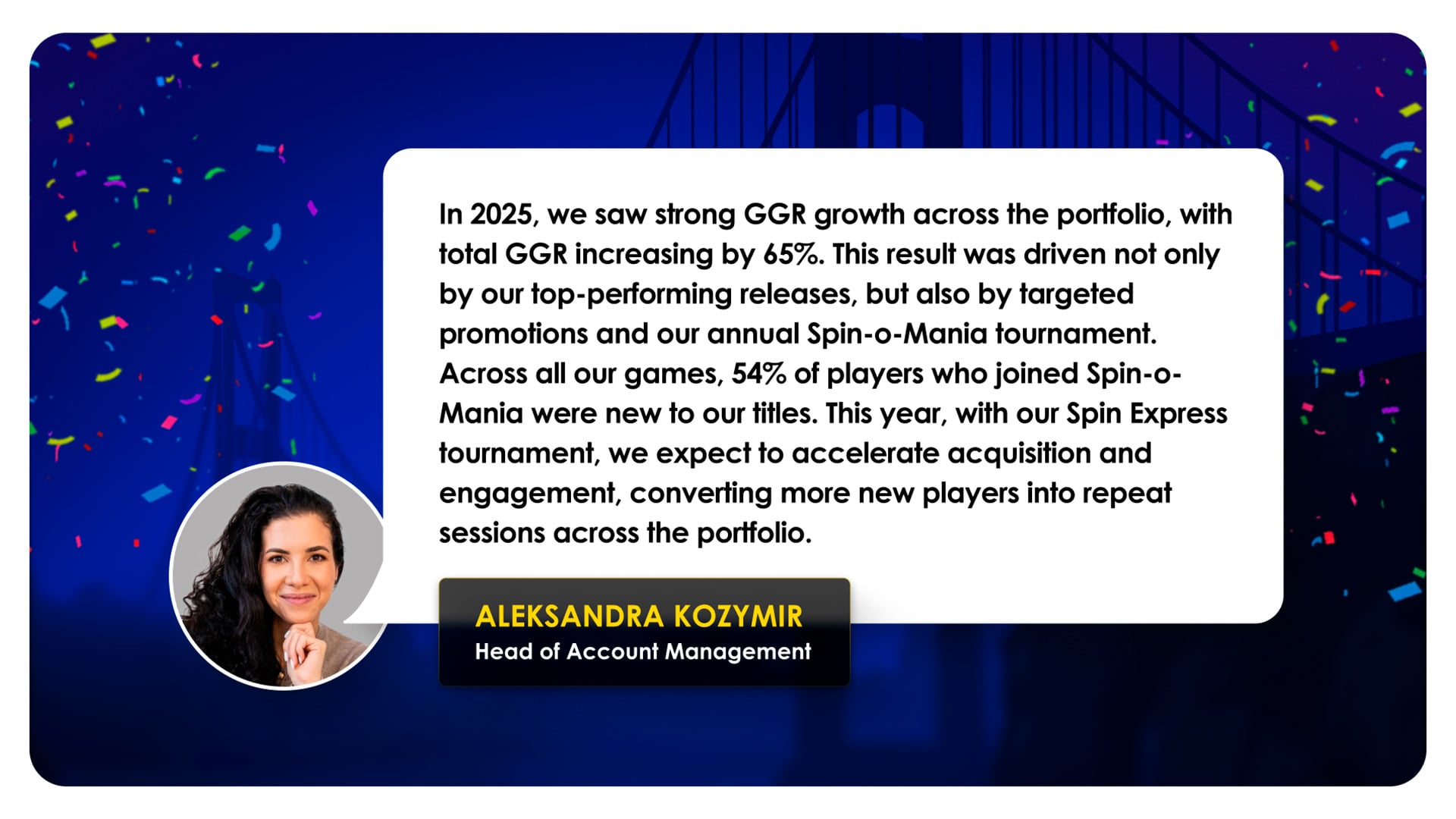 For Gamzix, an annual network tournament is part of a broader long-term engagement strategy. Spin-o-Mania showed this format can work as a stable, repeatable driver of portfolio habituation and”weekend retention.