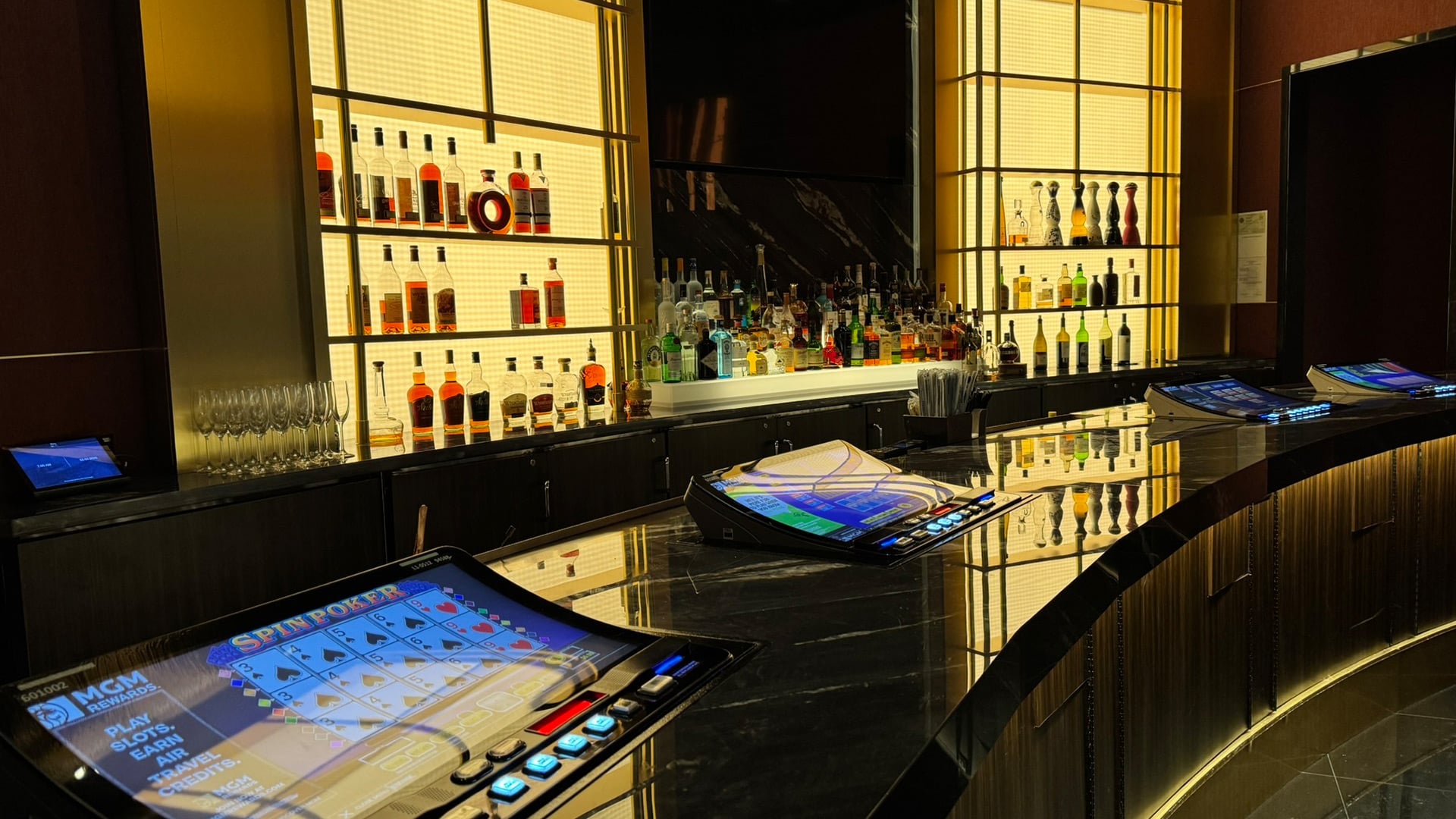 The High Limit Bar features a curated collection of premium spirits available exclusively within the High Limit area. Decorative metalwork, rich millwork, and stone accents define the contemporary design, while backlit stone paneling adds warmth and visual depth. A dedicated service bar, discreetly positioned behind the main bar, enhances efficiency and guest service.