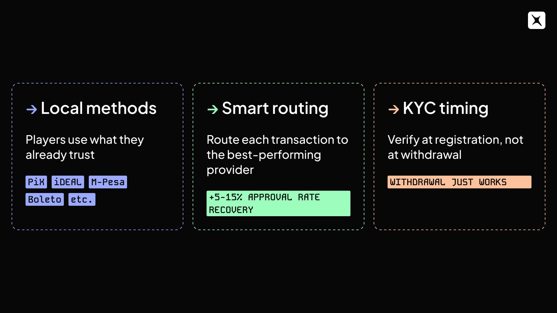 The first is local payment methods. Players will rarely go looking for alternatives when their preferred method isn’t available — it is easier for them to leave. Paying with an unfamiliar method feels uncomfortable before a session even starts. PIX in Brazil, iDEAL in the Netherlands, M-Pesa in Kenya — these aren’t exotic additions to a payment stack. They’re the default for players in those markets.