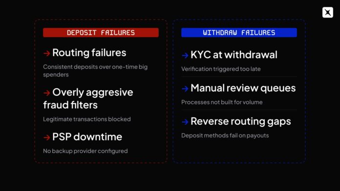 Most withdrawal failures aren’t policy problems — they’re infrastructure problems that were never prioritized. KYC verification triggered at withdrawal instead of registration means a player who just won something now has to stop and prove who they are. Manual review processes are not designed for volume, turning hours into days. Payment routing configured for deposits doesn’t always work in reverse — a method that accepts funds smoothly can still fail on payouts.