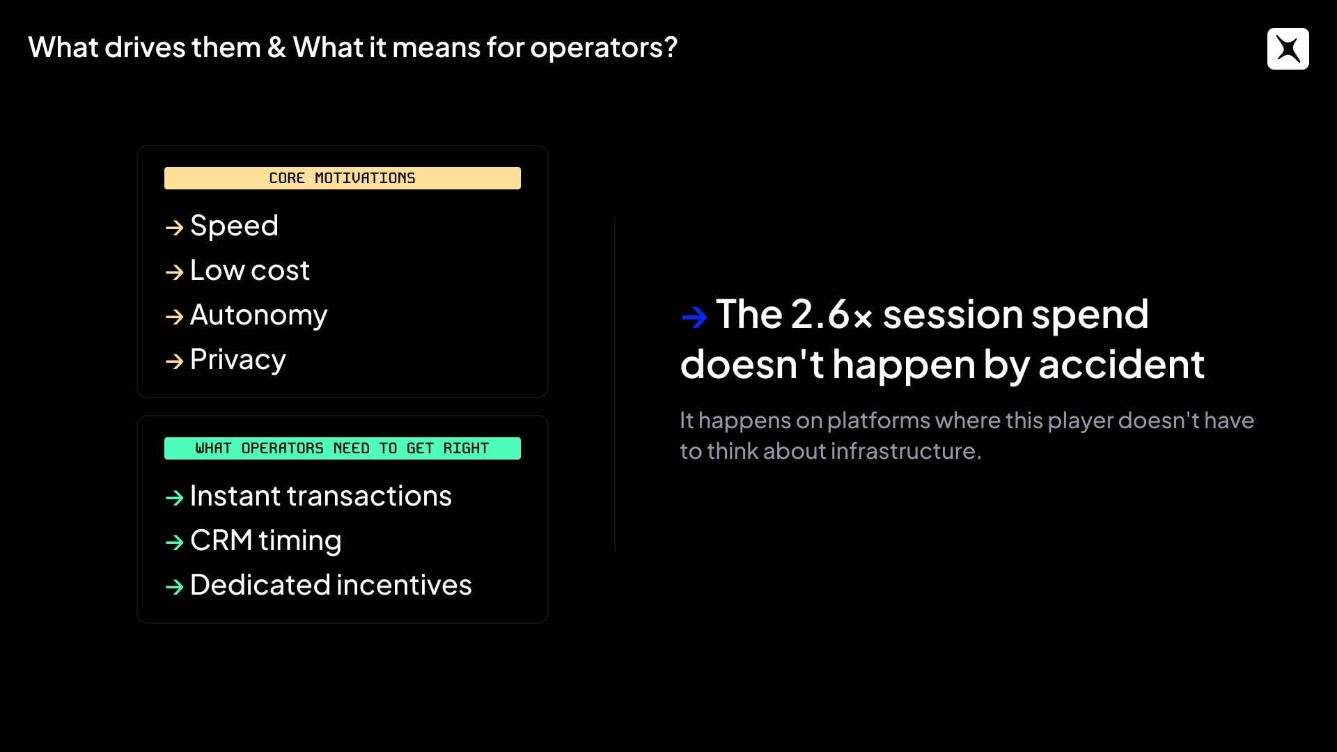 Crypto bettors don’t behave like traditional casino players. Crypto bets exceeded $26 billion in Q1 2025 alone — nearly double the volume from Q1 2024. Once this player lands on a platform, the numbers get more interesting: crypto users spend 2.6x more per session than fiat users on average.