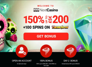 NextCasino will give you a 150% deposit bonus up to €/$ 200 and will also throw in 100 free spins on Twin Spin slot...
